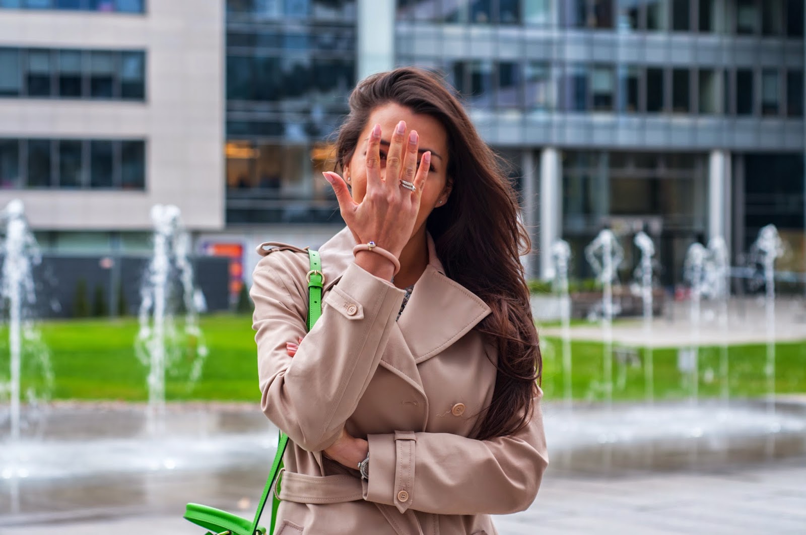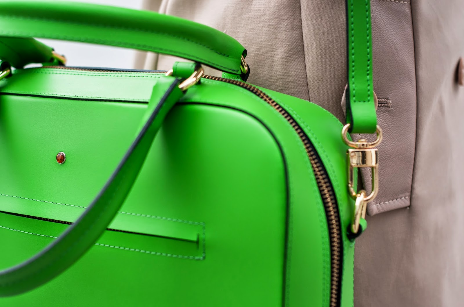 Propozycja eleganckiej bizneswoman, w nieco ciekawszym wydaniu niż mamy sposobność widywać na co dzień w biurowcach i w ich okolicach. Uważam, że każda bizneswoman może wyglądącć niebanalnie, ciekawie i elegancko. Bardzo lubię do takich stylizacji używać beżu “nude” do tego niezastąpiony, ponadczasowy granat. Żeby stylizacja nie była nudna dorzuciłam paselowe dodatki w kolorze bladego różu i tu mam na myśli naszyjnik i bransoletkę. Kontrast i niezauważalność zapewniła mi moja nowa, zgrabna, poręczna “teczka”. Kto by powiedział, że torebka kobiety sukcesu nie może być zielona 🙂 ?