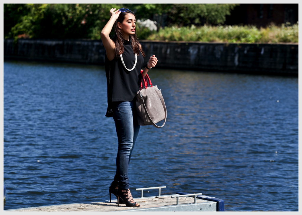 Bardzo łatwo osiągnąć taki efekt jak ze zdjęcia. Spodnie jeansowe każdy w szafie ma, szpilki również, czarne koszulki też na pewno nie stanowią wyzwania dla Was do tego ciekawa delikatna biżuteria i niebanalna torebka.