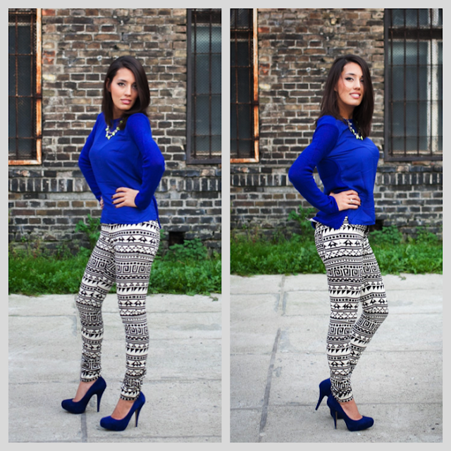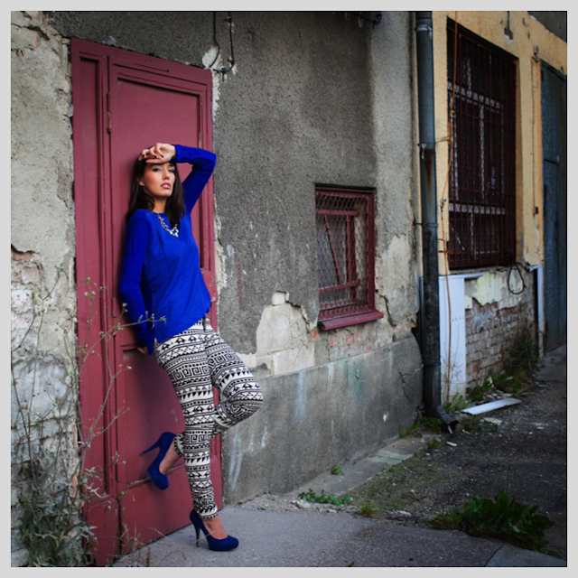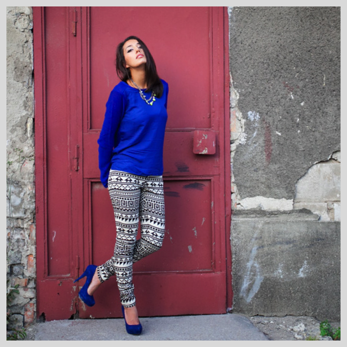 Tak jak pisałyśmy wcześniej również azteckie wzory podbiły gazety, wybiegi oraz sklepy, a może i serca niektórych z Was? Na pierwszy rzut oka może się wydawać, iż owy wzór jest bardzo trudny i nie da sie go nosić z niczym, co już mamy szafie. Otóż można spokojnie sobie z nim poradzić, stosując względny minimalizm. Jak tu teraz zrozumieć minimalizm w odniesieniu do azteckiech wzorów? Nie należy używać do stylizacji dodatkowo pasków kropek, innych dziwnych faktur, nadruków. Aztec prints można połączyć moim zdaniem z innymi raczej gładkimi tkaninami o zdecydowanych kolorach 🙂 Myślę, że wtedy wygląda całkiem nieźle. Ja skusiłam się na wzorzyste spodnie, do tego dołączył kabaltowy sweterek i neonowy naszyjnik. Wiem, że neon był modny latem, ale nikt nie wyrzuca swoich ukochanych rzeczy 🙂 Jeśli ktoś jest niższy, nie posiada bardzo długich nóg, to może spróbować z actecką górą np. topem etc. ponieważ powyższe spodnie lepiej wyglądają u osób trochę wyższych 🙂