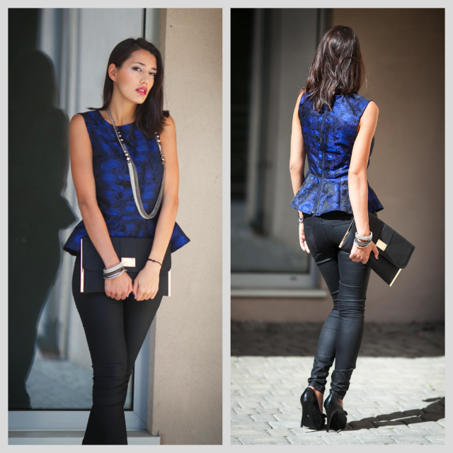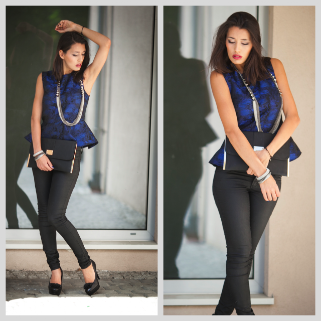 Prezentuje Wam proste i eleganckie zestawienie, nadającego sie do kina, do teatru jak również imprezę czy randkę. Baskinka, obecnie bardzo popularna, można znaleźć ją w wielu sieciówkach. Podkreślająca kobiece kształty. Jest urocza i delikatna. Dodajemy do niej proste ciemne spodnie, wyższe buty i kopertówkę, coś interesującego na szyję i jesteśmy gotowe do wyjścia. Taki Outfit sprawdzi się również podczas biznesowego spotkania czy w pracy, proponuję wtedy zmienić kolor szminki na bardziej neutralny.