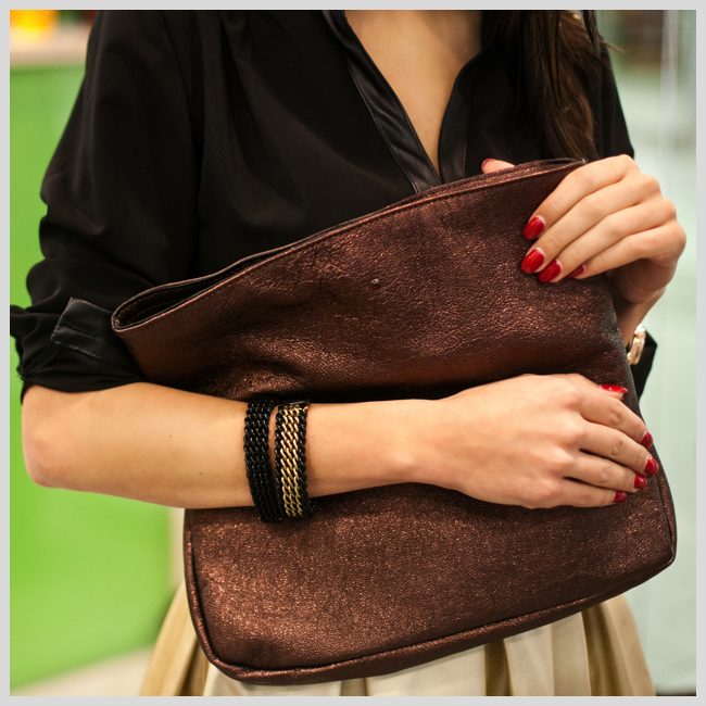 Zestaw który Wam zaprezentowałam to bardzo dziewczęca spódnica i romantyczna koszula z akcentem “ćwiekowym” wszystko ozdabia torebka miedziana. Niewątpliwie w tej stylizacji użyłam odcieni złota:) Dodatkowo zaprezentowałam Wam moją ulubioną obecnie biżuterię, której autorką jest niezwykle zdolna Krystyna Odolińska. Szczerze powiem, iż nie znam drugiej tak zdolnej pomysłowej osoby, a zarazem tak skromnej i stonowanej. Biżuteria Kod Design robi furorę nie tylko w Polsce, ale także za granicą. Możemy być dumni z tej Polki. W następnym postach pokażę Wam fenomenalne zapierające dech w piersiach naszyjniki!!!