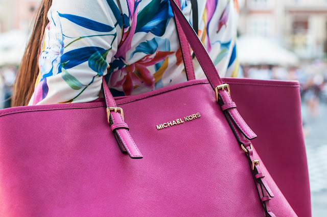Kwiatowa sukienka to jedna z moich ulubionych w szafie mimo, iż kosztuje naprawdę niedużo prezentuje się bardzo ciekawie. Do tego nieśmiertelny fuksjowy Kors, który komponuje się z kwiecistym motywem sukni plus bardzo modne w tym sezonie metaliczne baleriny na koturnie 🙂