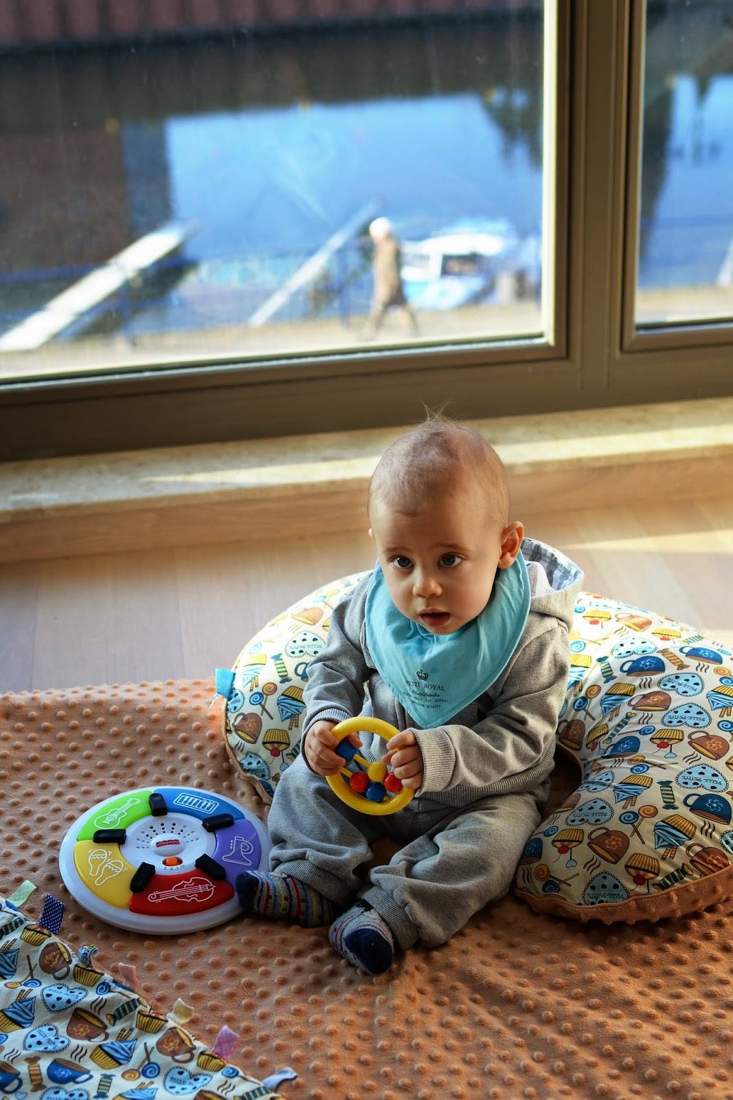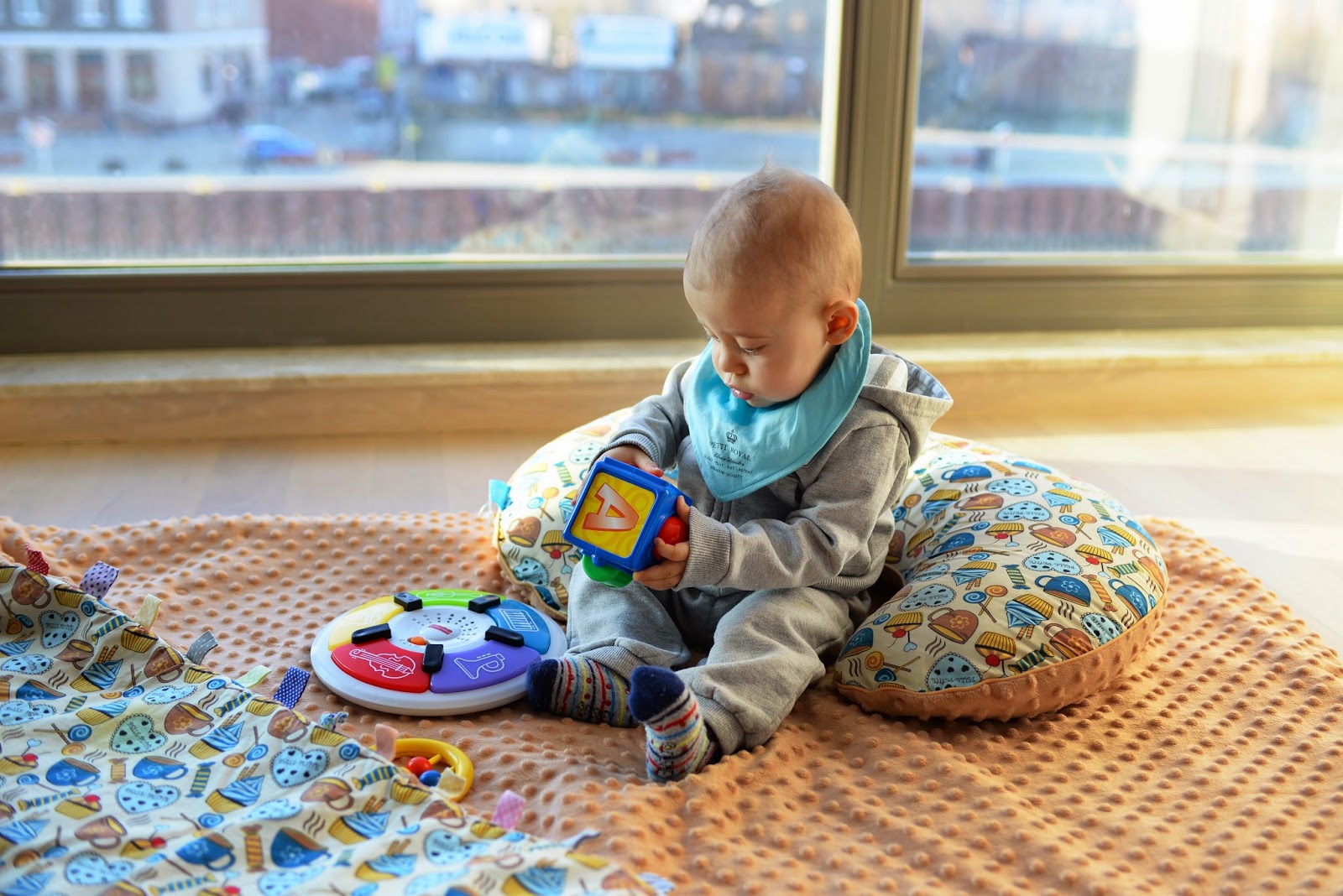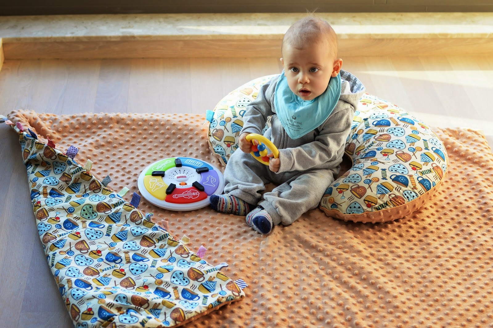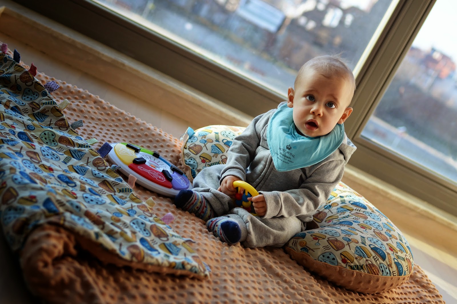 Jak widzicie Franek używa nie tylko kocyków, ale również poduszki rogala. Chciałam Wam kilka słów powiedzieć o tym wielofunkcyjnym gadżecie, bo przez kolejne miesiące odkrywam jego świetne funkcje. Pierwsza to poduszka do karmienia dziecka, a i owszem zgodzę się z tym. Kolejna to oparcie dla głowy do spania w samochodzie np. dla Mamy. Ostatnio odkryliśmy dodatkowe zastosowanie, a mianowicie podczas nauki siadania tzw. podporę żeby dzidzia jak się zamyśli podczas zabaw nie przechyliła się do tyłu.