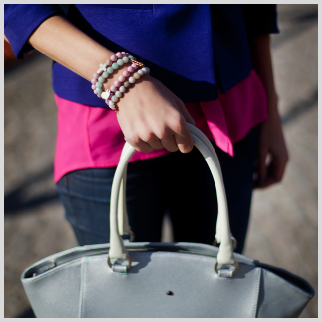 Stylizacja którą przygotowałam to gra wiosennych barw i mieniących dodatków. Torebka jest jak kameleon w każdym świetle lekko się zmienia, jest naprawę wyjatkowa, to specjalna skóra. Chylę czoła dla pomysłodawcy. Wszystkie kolory które tutaj użyłam są również dobre i twarzowe dla blondynki 🙂