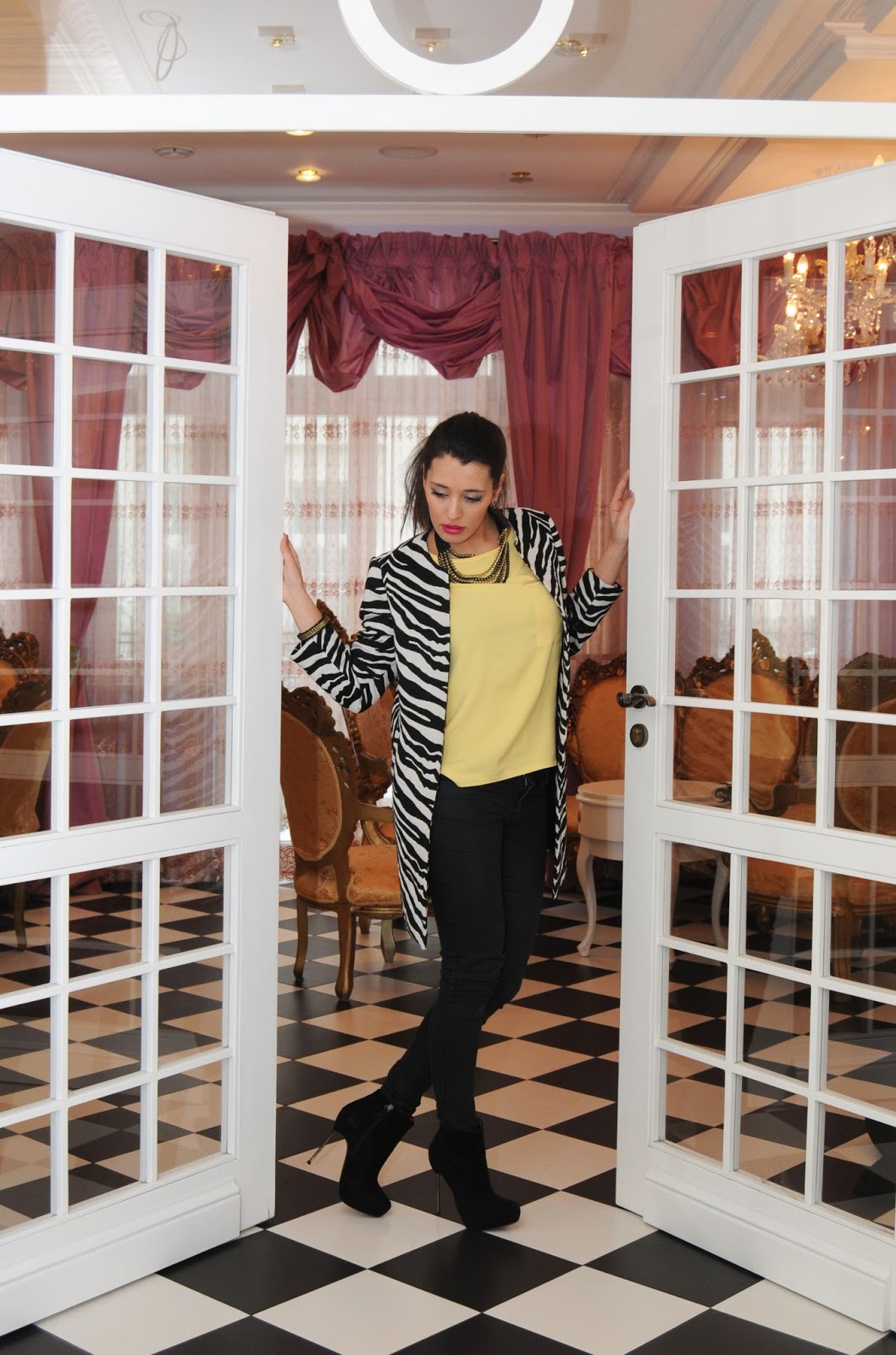 Dopadał i mnie trend połączenia czerni z bielą tzw. zebry. Bardzo lubię takie monochromatyczne outfity. Przeglądając magazyny modowe oraz wybiegi, aż nie mogłam się oprzeć. Niemniej jednak postanowiłam go trochę zmodyfikować, by każda z Was poczuła się wyjątkowo. Proponuję wprowadzić do outfitu “zebry” jeden odważniejszy kolor np. zółty fuksję czy turkusowy. Każda z Was na pewno posiada czarne i białe elementy w swojej garderobie, proponuję by były proste w swej formie i w miarę jednolite(bez zbędnych wzorów), a koszulka bądz dodatki w wyżej wymienionych kolorach. Myślę, że taki ubiór wywoła efekt “WOW”